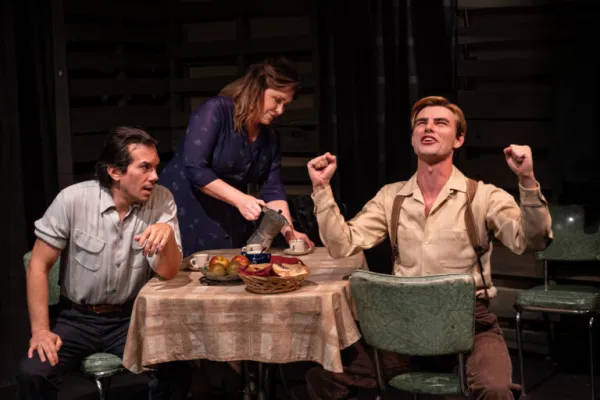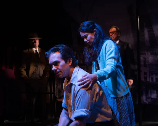 Kim Chase’s worldly-wise Beatrice senses her husband’s inner turmoil and despite her lack of formal education, understands what seems to be going on. A genuinely good person, she is put on the horns of a dilemma as Bea, too, is caught between Eddie, her kinfolk and her own self-interest as a housewife reliant on her husband, the breadwinner. Brandon Lill also stands out as Rudulpho, the laborer from Italy hellbent on bettering himself in America, and who may be a little too talented and good looking for his own good, as Eddie projects his own conflicts on him. The entire ensemble is adeptly directed by Mike Reilly in a set, with a photo mural backdrop of the Brooklyn Bridge, so intimate that theatergoers may feel like they’re in the proverbial fourth wall.