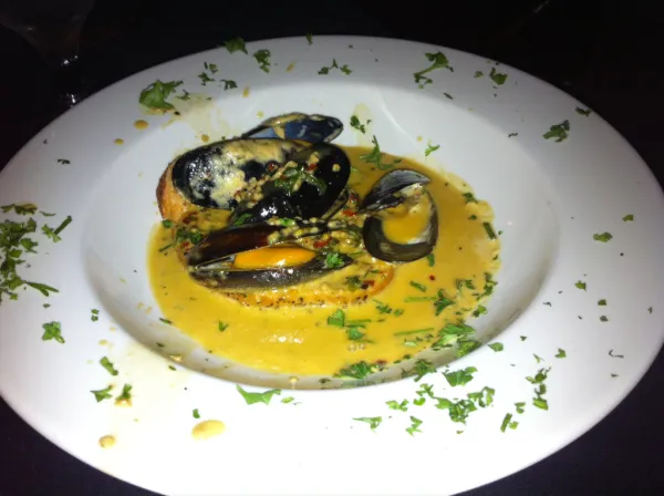 My favorite dish was a serving of mussels. These were prepared in a sauce of white wine, heavy whipping cream (Snowville of course), garlic, red pepper flakes and parsley. All simple ingredients and all mixed to just the right proportion. The sauce and mussels were draped onto a freshly toasted slice of bread which swam and then sunk into the sauce. The best sign of a good dish of mussels is when I choose to drink the sauce at the end. I left no drop behind.