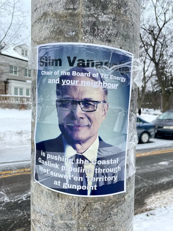 Toronto, Ontario, Canada — This morning, Toronto supporters of the Wet’suwet’en land defense struggle against the Coastal Gaslink pipeline set up construction sites at the Toronto homes of TC Energy Board Chair Siim Vanaselja and Royal Bank of Canada Executive Doug Guzman. The supporters also flyered the neighborhood with photos of the two men with signs warning, “Your neighbour is pushing the Coastal Gaslink pipeline through Wet’suwet’en Territory at gunpoint.”
