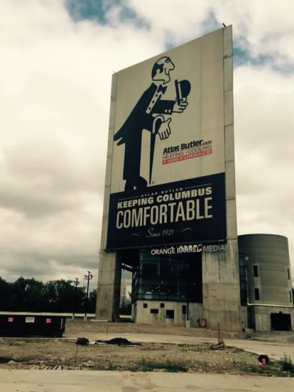 When has advertising and branding gone just a bit over-the-top? How about a massive billboard sporting a hat-tipping, giant balding butler that has seemingly blocked out the Columbus skyline along with half the summer sun?
