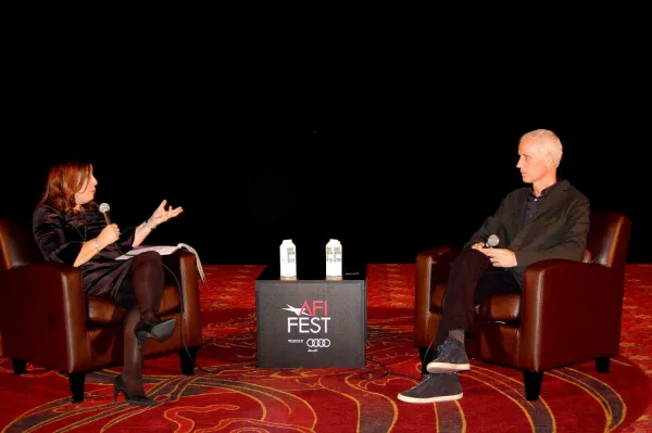 S"Roman J. Israel, Esq." director Dan Gilroy with a film critic. Photo by Ed Rampell.