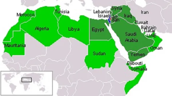 Map of Israel and members of the Arab League (Comoros is not shown). Image credit Maphobbyist, CC 3.0 unchanged