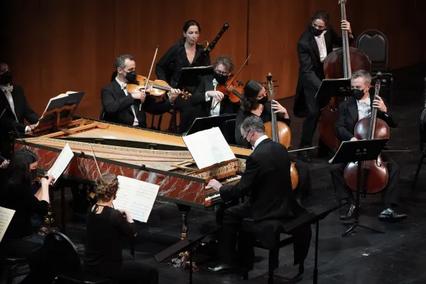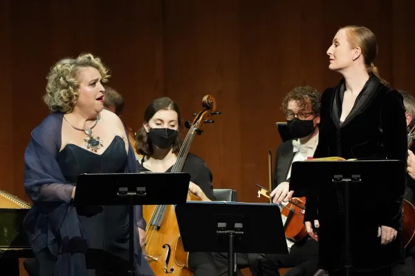 In their LA Opera debut The English Concert performed the three-act, three-and-a-half-hour production in, more or less, modern dress and sans the elaborate sets and props that often regale the Dorothy Chandler Pavilion’s sumptuous stage. The 20-plus musicians of The English Concert, presided over by Liverpudlian Harry Bicket – who also displayed virtuoso finger work on a period harpsichord – did not play in the pit, where James Conlon usually conducts the LA Opera Orchestra. Rather, The English Concert performed onstage, where they were periodically joined by Alcina’s six singers, standing behind music stands holding the opera’s score and lyrical libretto. (Thomas Foster is also listed in LA Opera’s credits under harpsichord.)