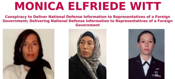 Monica Elfriede Witt, 39, a former U.S. service member and counterintelligence agent, has been indicted by a federal grand jury in the District of Columbia for conspiracy to deliver and delivering national defense information to representatives of the Iranian government. Witt, who defected to Iran in 2013, is alleged to have assisted Iranian intelligence services in targeting her former fellow agents in the U.S. Intelligence Community (USIC). Witt is also alleged to have disclosed the code name and classified mission of a U.S. Department of Defense Special Access Program. An arrest warrant has been issued for Witt, who remains at large.