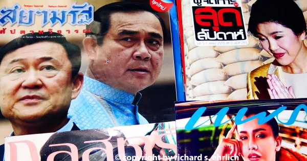 After Army Chief Prayuth Chan-ocha [center] ousted the government of [left] Thaksin Shinawatra's sister, then-prime minister Yingluck Shinawatra [upper right], the battle between the Shinawatra family and the military has fixated Thailand.photo credit: Photo copyright Richard S. Ehrlich