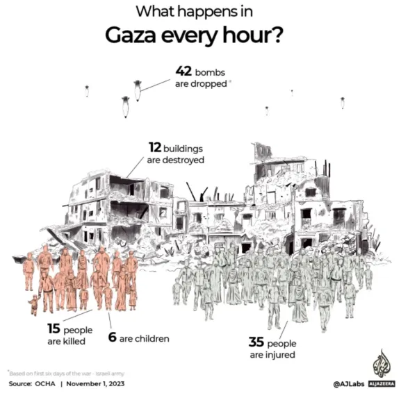 More than half of Gaza’s homes, 360,000 residential units have been destroyed or damaged. 392 educational facilities destroyed. 11 out of 35 hospitals are partially functioning. 132 ground water wells damaged or destroyed, and 267 places of worship were demolished.