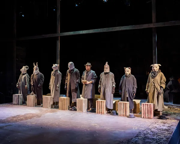 Animal Farm is being mounted through October 2 on Fridays at 8:00 p.m.; Saturdays at 2:00 p.m. and 8:00 p.m.; and Sundays at 2:00 p.m. There will be one additional performance, on Thursday, Sept. 29 at 7:30 p.m. Post-performance conversations with the artists will take place on Fridays, Sept. 9; Sept.16; Sept. 23; and Sept. 30, and on Sunday, Sept. 11. An INsiders Discussion Group will be held on Tuesday, Sept. 13, from 6:00 p.m.–8:00 p.m. on Zoom ($38 per individual or $45 per household). In addition, there will be 10 student matinees at 10:30 a.m. on Tuesday, Sept. 6; Wednesday, Sept. 7; Tuesday, Sept. 13; Wednesday, Sept. 14; Thursday, Sept. 15; Tuesday, Sept. 20; Wednesday, Sept. 21; Thursday, Sept. 22; Tuesday, Sept. 27; and Wednesday, Sept. 28. Interested educators should email education@anoisewithin.org.