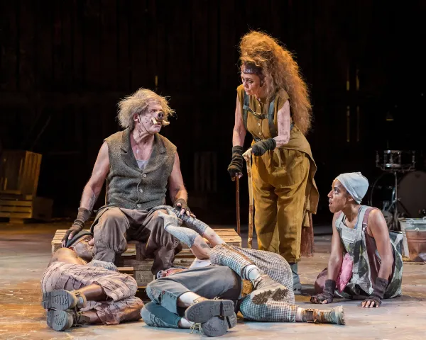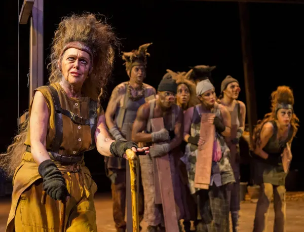 ANW producing artistic director Julia Rodriguez-Elliott helms her sprawling cast tautly, with a Brechtian sensibility in terms of the mise-en-scène atop Calin’s thrust stage, which has a barnlike ambiance. Calin’s costumes, Valdes’ wigs and makeup, Dillon Nelson’s masks plus Ken Booth’s lighting bestows a Mad Max-like vibe upon the production, which serves Orwell’s dystopian themes extremely well. Live musicians playing piano, drums, woodwinds, trumpet and flugelhorn bring Richard Peaslee’s music vividly alive, sometime chillingly, other times stirringly.