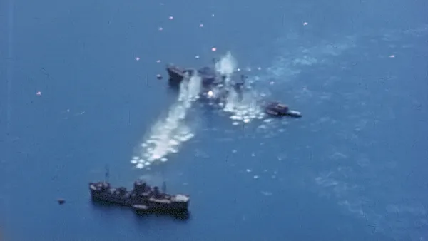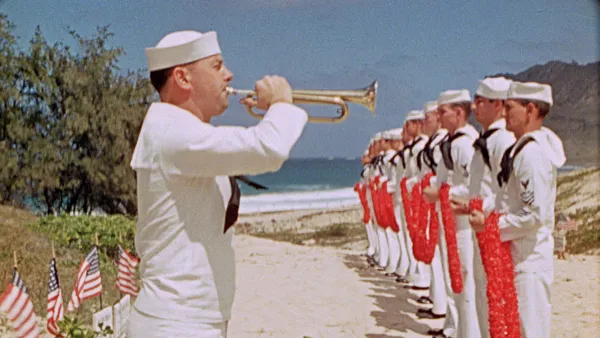 Apocalypse ’45 sort of bookends with Hiroshima, with rarely if ever publicly seen footage shot by a U.S Army medical camera crew there and at Nagasaki as the decimated cities smolder and burn victims are treated. Honolulu also figures in the opening and ending of this saga, including scenes lensed by Hollywood legend John Ford, a Rear Admiral during WWII, of Pearl Harbor shot shortly after the sneak attack, revealing a ravaged Pacific fleet that Apocalypse ’45 has rescued from archival obscurity hidden away in the vault.