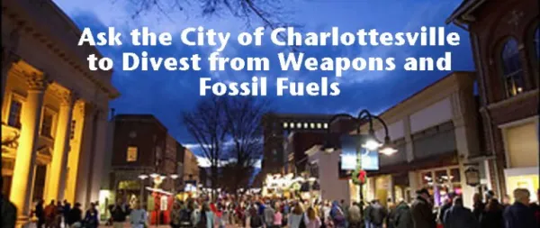 The City of Charlottesville has approximately $3 million invested in fossil fuel companies ($1.4 m in energy company bonds, plus approximately $1.6 m through funds invested in by Charlottesville’s retirement fund). It may have about the same in weapons companies, as it has $1.1 m directly invested in four “aerospace and defense” companies: Boeing, Heico, Honeywell, and Moog. Boeing and Honeywell are two of the biggest war profiteers including through the wars of Saudi Arabia that even the U.S. Congress is now turning against.