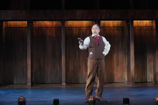 Sondheim’s (who of course wrote the immortal lyrics for West Side Story) eerie musical explores these criminals and their motives with insight, wit, pathos and varying degrees of historical accuracy. The ensemble cast, deftly directed by EWP’s Producing Artistic Director Snehal Desai, with musical direction by Marc Macalintal, wreak their mayhem from an imaginative multi-level set designed by Anna Robinson, which is periodically emblazoned with projections designed by David Murakami with assistance from Sam Clevenger. The singers are accompanied by a live sextet, enhancing the overall production values of this musical, which had originally opened Off-Broadway in 1990 for only 73 performances, but was revived on Broadway in 2004 where it snagged five Tony Awards.
