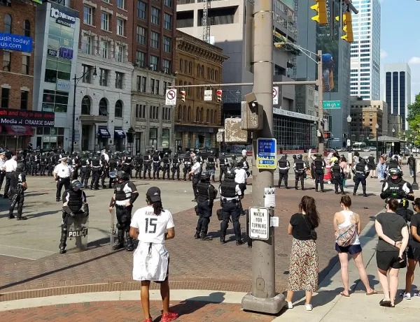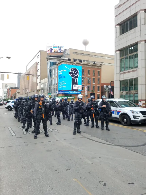5 pm: Over 81 police cars with CPD officers in riot gear lined up as far as the eye can see down High Street, in response to BLM protesters at the Ohio Statehouse. Major overtime. Your tax dollars at work.