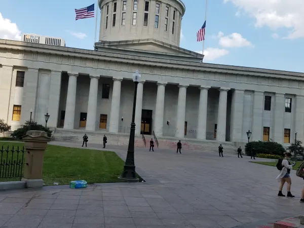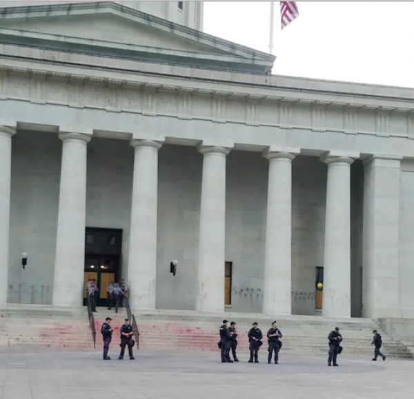5 pm: State police guarding the Ohio Statehouse during protests Sunday evening. Note red paint on stone facade, remnants of "bloody" handprints applied by protesters on Friday.