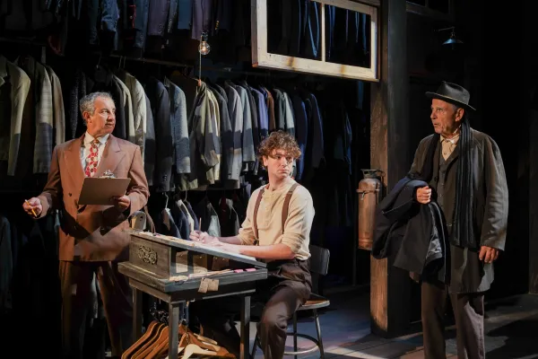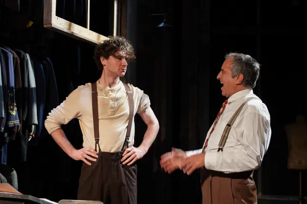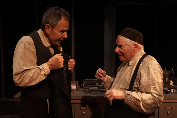 Scenic designer Rich Rose’s set deftly combines the locations delineated in the play (although there is no samovar, alas!), which takes place in London’s East End at some unspecified time in the early to mid-20th century. Fender (a cherubic Harry Herman) is an aging Russian émigré Jew and shipping clerk, who has worked decades for a family business at a desk located on stage right, in front of racks and racks of overcoats. Despite the expertise he has accumulated over the years, Fender has little pay and even less respect than Rodney Dangerfield to show for his lifelong labors.