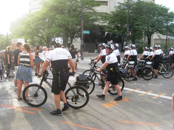 When the marchers arrived at police headquarters, officers on bicycles surrounded them and forced them onto the sidewalk. Five officers decided to make an example out of Tynan Krakoff, who is white. They arrested him on three charges, including pedestrian use of a roadway.