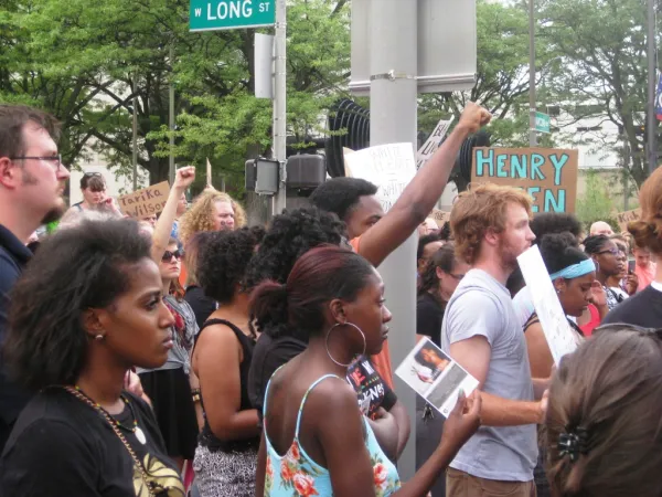 After marching on the sidewalk around the Statehouse, the protesters took over the northbound lanes of High Street for several blocks as they proceeded to police headquarters. Police cruisers surrounded the marchers with lights on and sirens blaring. When police ordered them out of the street, some protesters complied and others didn’t.