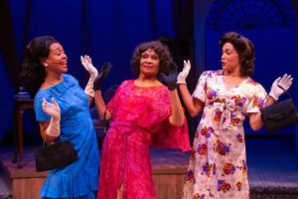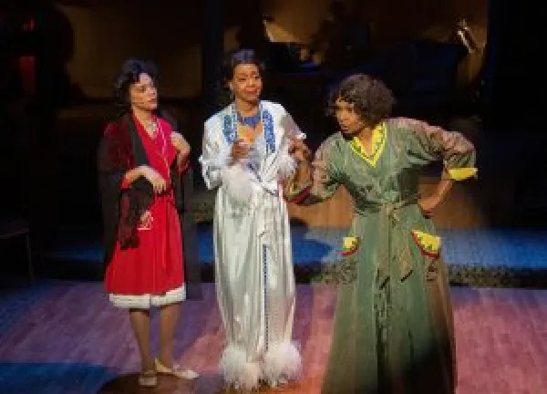 The trio of women are adorned in period dress (and sometimes undress, in fashions by costume designer Kim DeShazo) and tread the boards of a set identified in the program as a Chicago Hotel in 1948. The semi-thrust stage (scenic designer Edward E. Haynes Jr.) is subdivided into three sections, each supposed to be their own separate hotel rooms, while the musicians are discretely situated behind the stage, silhouetted by a curtain. In the ladies’ boudoirs they sing solo or sometimes they come together and hold forth jointly (the Man in the Saloon joins them from time to time).