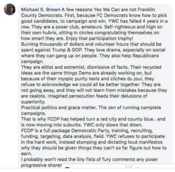 Yes We Can is to be congratulated for taking on the Franklin County Democratic Party machine again, though the Party machine under the control of Boss Ginther and his sidekick Shannon Hardin, fight any new voices and ideas with all their might. Yes We Can exists because the Republican Party has clearly given up contesting elections in Ohio’s capital city. Or maybe they determined they don’t need to oppose the Franklin County Dems, whose Republican-lite policies are so pro-elite and the “unelected, but appointed” Columbus City Council members are all owned and operated by wealthy developers. Next mayoral election, Yes We Can should run a mayoral candidate to oppose the anointed one and bring out some new voters.