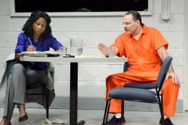 The entire one act two-hander takes place in the visiting room of a prison where Gloria (Judith Moreland), an African American history professor, has received hard-to-get permission to interview Rick (Bo Foxworth), a Caucasian, tattooed inmate in an orange uniform. (I guess orange really is the new Black!) The play opens with lots of back and forth: will he/won’t he? talk about what sounds like a heinous crime Rick has been convicted of and may face the death sentence for.