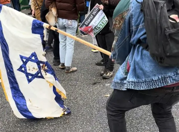 A screenshot from video captured at the scene shows a masked man holding the flag of Israel as it smolders. Photo credit: The Jewish News of Northern California