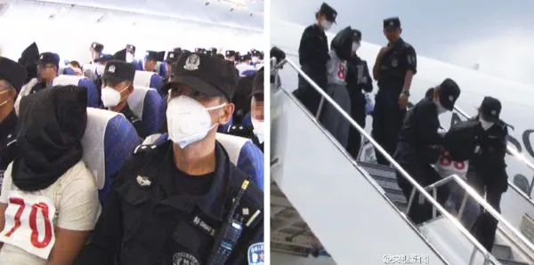 the heads of handcuffed "jihad" Uighur passengers onboard their forced