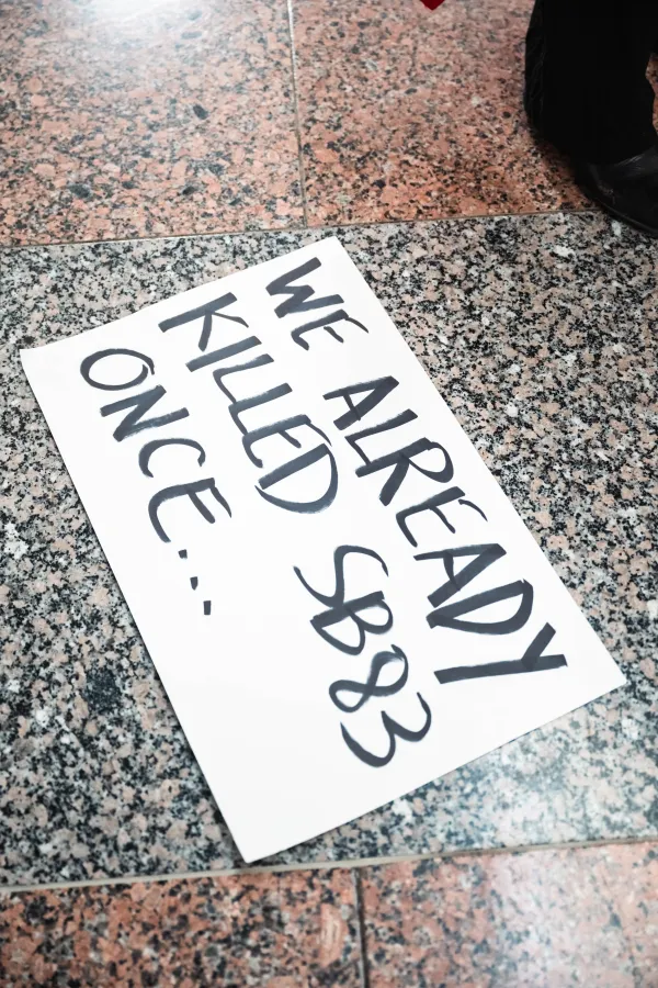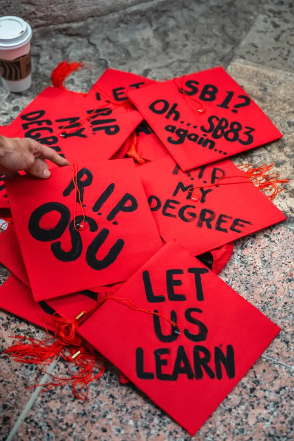Students gathered in the atrium holding signs and graduation caps reading “Listen to Students” and “R.I.P. my degree” before marching to the hallway outside the Harding Press Room. Students chanted as incoming Chair of the Senate Higher Education Committee, Kristina Roegner, took the stage, her speech overshadowed by the booming chanting of college students: “Higher ed will be dead”.