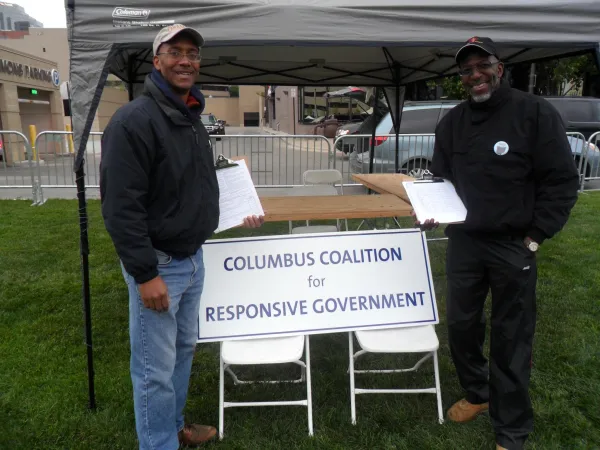 Earlier this week, the Columbus Coalition for Responsive Government filed new petitions seeking a campaign finance reform law for Columbus elections for Mayor and City Council. In late 2013 the Coalition submitted a sufficient number of petition signatures to qualify for the ballot, but a protest by Columbus elector Brian Rothenberg, who was represented by Columbus election lawyer Don McTigue (who also serves as Treasurer of Council President Andrew Ginther’s “Friends for Ginther” campaign fund), resulted in the Franklin County Board of Elections finding deficiencies in the petition form and declaring that the petition would not be on the ballot.