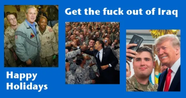 Basta! End it! Remove every troop, every mercenary, every contractor, every base, every weapon, every flag. Load up the planes, lift them off the ground, and get the Fallujah out. If you want to do good rather than harm, send actual aid, send reparations, send apologies, promise never to do it again, join the International Criminal Court and send top guilty parties over for indictment and trial. Democratize the United Nations and commit to obeying the law. Stop raising the planetary thermostat to the point that will make Iraq uninhabitable. That, along with ending the wars on Yemen, Afghanistan, and Syria, seems like the least we could do. Let’s resolve to take that positive step in the coming year if not the coming week.