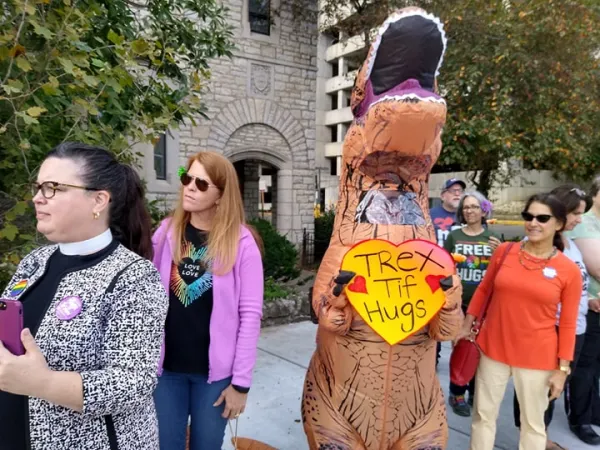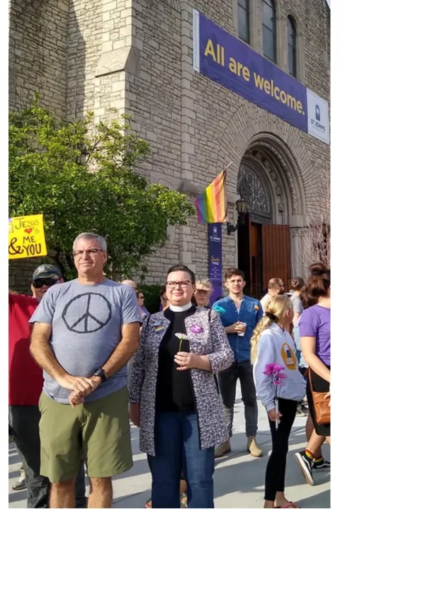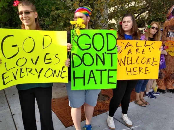 When Westboro Baptist protestors descended on St. John's United Church of Christ on Columbus' near east side to demonstrate again the "Jezebel Preacher," over 130 counterprotestors showed up to peacefully defend their female pastor. The Rev. Virginia Lohman Bauman, targeted for being a female preacher who opens up the church to a congregation that includes LGBTQ people, called it "an amazing spiritual experience" as she was joined by so many supporters on very short notice, according to the United Church of Christ website. According to the website, Columbus Police tipped off the church that the notorious anti-gay Westboro Baptist protestors were coming their way on Friday, August 30. The demonstration happened Sunday, September 1. Trinity Evangelical Lutheran Church was the second target of the Westboro group and counterprotestors kept up their viglance against the haters there. Rev.  Gary Witte and his wife Winifred Wirth joined in the counterprotest and supplied the photos displayed here for the Free Press. Witte reported that the huge outpouring of support by the community for the churches far outnumbered the members of the Westboro Church protest.