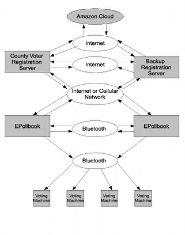This scheme creates a host of vulnerabilities. There is now a direct line of communication between a cloud computing service and individual voting machines. That line of communication can be attacked via cellular intercept, via Bluetooth, via the internet, via a thumb drive, or via an SD card. Access to the cloud means trusted access to the database and thus all the functions downstream. Access to the main registration server means access to the backup server. Access to a single polling place means access to the entire county.