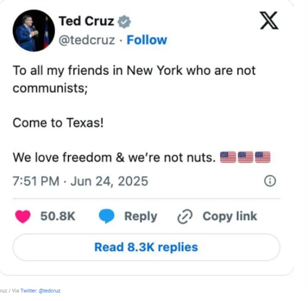Sen. Ted Cruz (R-TX) Buzz feed has a story on June 25, titled "People can't stop laughing at Ted Cruz's meltdown over Mamdani's winning in NYC." This Republican lawmaker who fled his home state for Mexico in 2021 when freezing winter story shut down Texas' power grid. Ted Cruz reportedly spent the weekend hitting tourists' spots in Europe while a devastating Lone Star State flood killed at least 90 campers. After a reporter asked his office when did the Sen. booked a flight back, the staff refused to answer.
