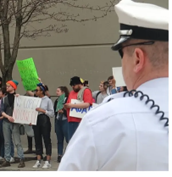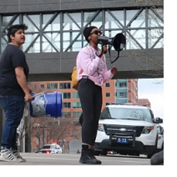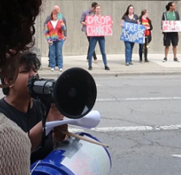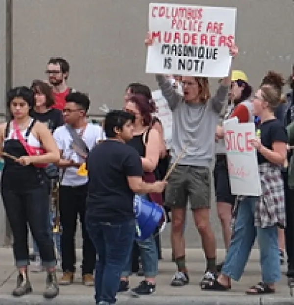 Over 50 people marched from Bicentennial Park to the Franklin County Juvenile Detention Center today to demand the release of Masonique Saunders, 17, who was incarcerated last December. Saunders is being charged with felony murder after Columbus police shot and killed her boyfriend, Julius Tate, in an undercover operation. Saunders was not involved in the murder.