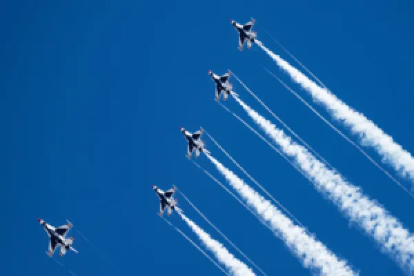 USAF Thunderbirds with only 4 or the 5 planes spraying from all 3 aerosol turrets (Note clear blue sky)