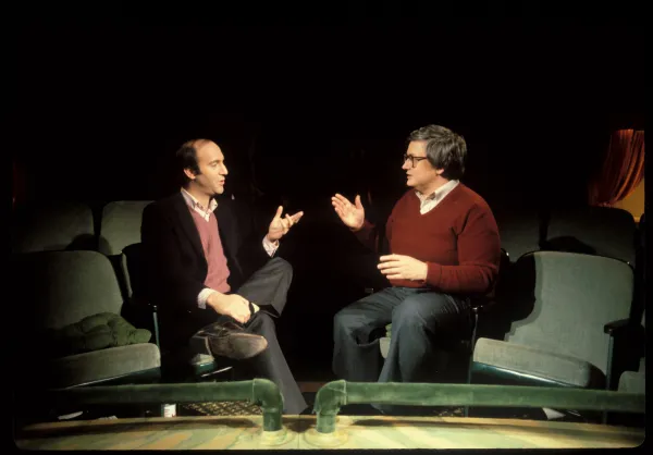 Gene Siskel (left) and Roger Ebert compare cinematic viewpoints in an archival scene from Life Itself (photo by Kevin Horan; courtesy of Magnolia Pictures)