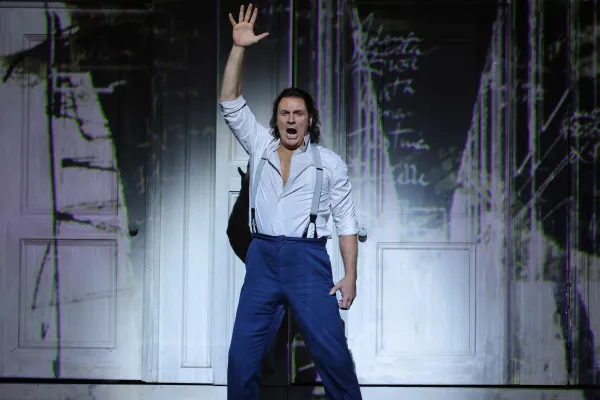 Indeed, the number of Don Giovanni’s sexual “conquests” surpasses 1,800, which his much put-upon servant Leporello (the scene-stealing California bass-baritone Craig Colclough) lists in the funny “Catalogue Song,” wherein he sings the names of the countless women his “master” has bedded to the deserted Donna Elvira (New York mezzo-soprano Isabel Leonard), after she has confronted her onetime lover. The lovers’ many names are cleverly projected on English scenic designer Es Devlin’s moving set.