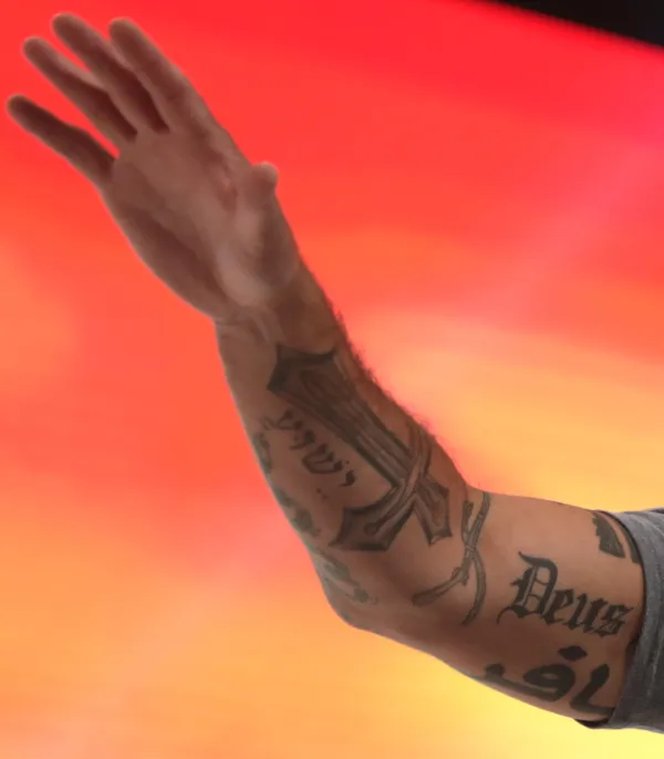 Pete Hegseth "Deus Vult" arm tattoo; Gage Skidmore from Surprise, AZ, United States of America, CC BY-SA 2.0 <https://creativecommons.org/licenses/by-sa/2.0>, via Wikimedia Commons