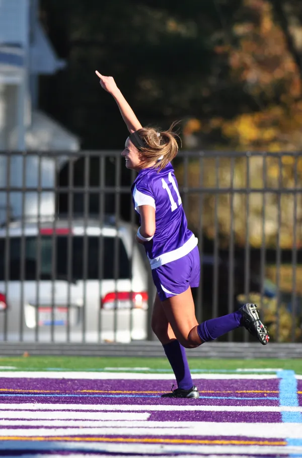 Hilary Ells gives the number one sign after scoring the final goal in a 4-2 win over John Carroll in the 2011 OAC championship game.