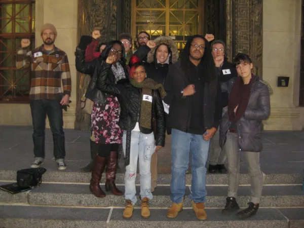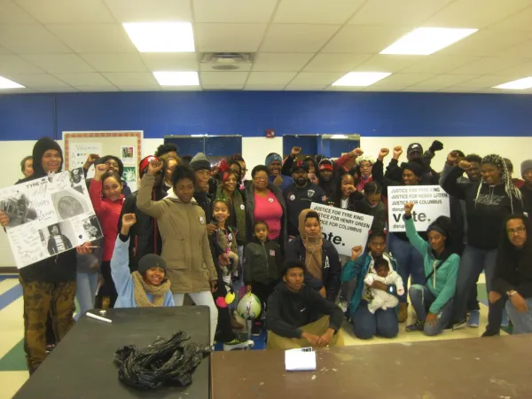 Ty’re King’s mother Nia Malika King (center) and supporters of the People's Justice Project at Columbus City Hall after the December 7 Public Safety Committee budget hearing.