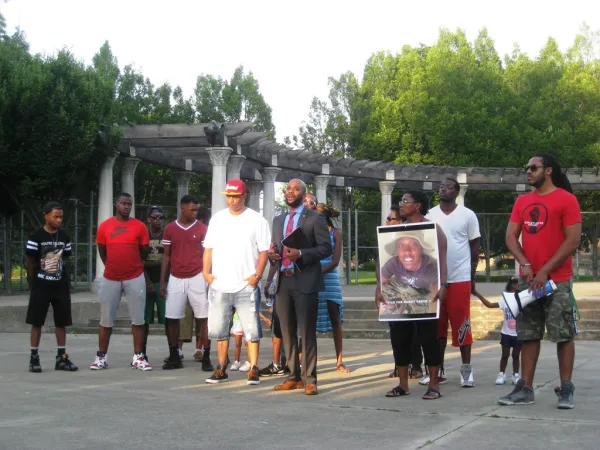Adrienne Hood, mother of Henry Green, speaks at the Franklin Park Amphitheater on July 8.