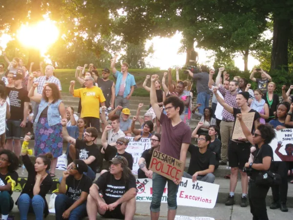 As news came in Thursday night about the shootings of Dallas police officers, the original organizers of the action postponed it, citing safety concerns. This didn’t sit well with many who planned to be there. By early Friday afternoon new plans were in place for a speak-out in the evening at the same location. About 450 people showed up.