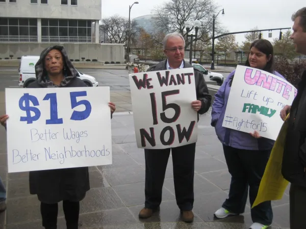 An aide delivered a message to the rally from U.S. Senator Sherrod Brown. “Every worker deserves to earn a living wage,” Brown said. “Your advocacy amplifies the call for economic justice.