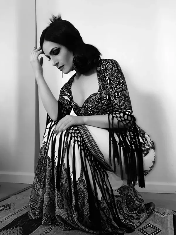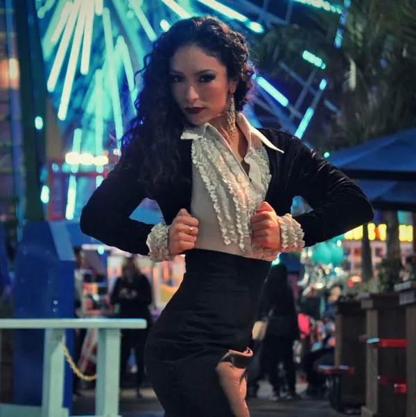This distinctive mélange of the Andalusian and Arab was on full display August 28 when I caught the second of Forever Flamenco’s Fountain performances, presided over by artistic director Reyes Barrios. A trio of dancers trod under the stars on the boards of the Fountain’s new open air, socially distanced 99-seater. Sometimes Lakshmi Basile, Timo Nuñez and Reyes Barrios performed together as couples or a threesome, other times their rhythmic foot-stomping was executed, shall we say, “’O sole-o mio,” giving each dancer his/her place in the sun (or, more properly, the moon, as it was a nocturnal show). The elegant hoofers wore different costumes that alternated between the colorful and traditional high-waisted black pants black vests and white long-sleeved shirts.