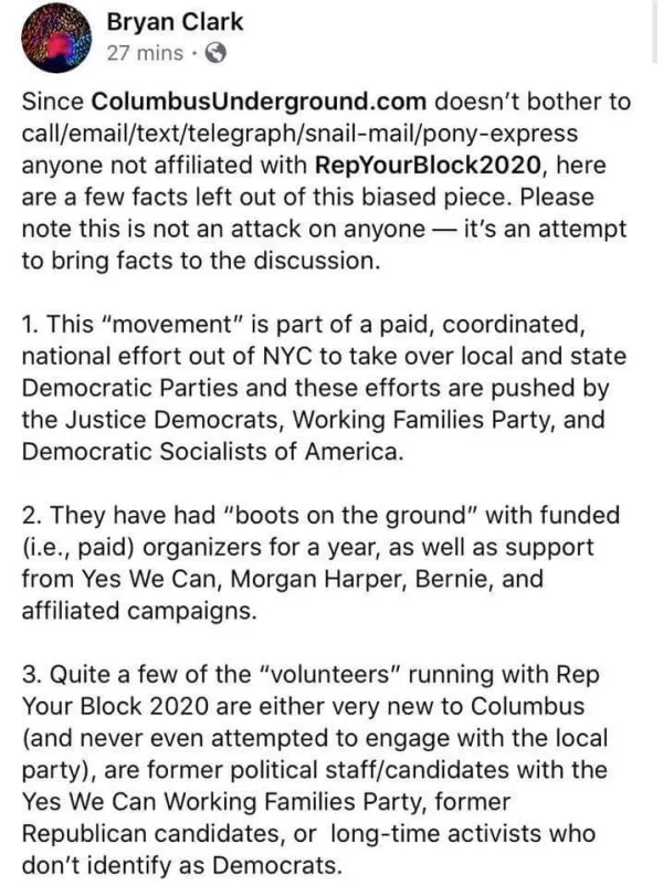 When Columbus Underground ran a story about #RepYourBlock2020 in January, Columbus Mayor Andrew Ginther’s chief policy advisor Bryan Clark posted an ill-advised Facebook rant against the group. It was a clumsy attempt to discredit the candidates by accusing them of things that are not demonstrably true, and other things that would not be nefarious even if they are true (for example, that they have the support of Morgan Harper and Bernie Sanders). Clark quietly removed the Facebook post after Scott Woods effectively debunked his claims and rhetoric in a Columbus Alive article.