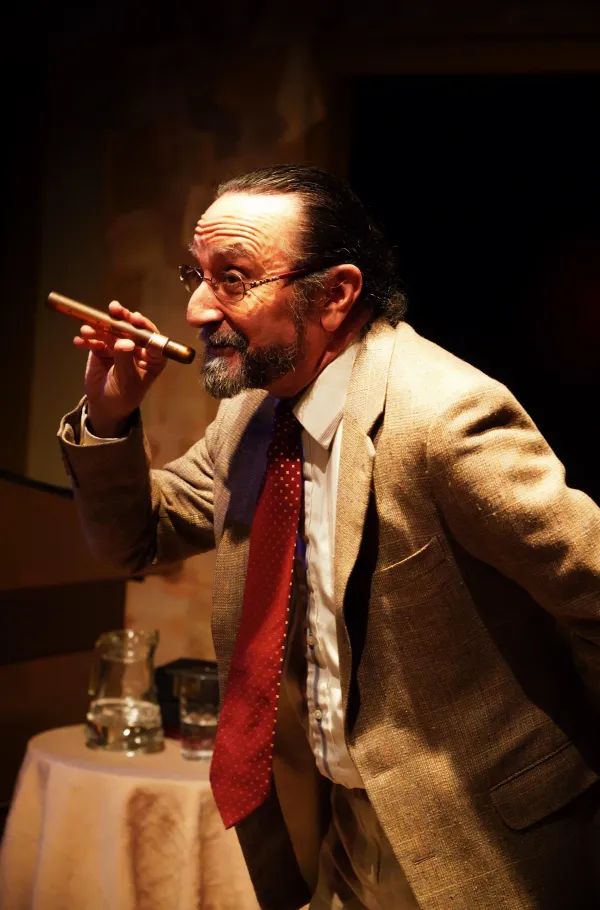 Playwright Willard Manus’ The Funny Man is a one-man show starring Sam Aaron as the Oscar-winning humorist S. J. Perelman, who The New York Times called “an artist whose nonpareil gift of ridicule, dazzling verbal effects, polished style, and keen observation made him a unique and precious figure in our literature.” The conceit of this solo show is that Perelman has been invited to the University of California at Santa Barbara in order to deliver a lecture on creative writing in 1976, when the screenwriter/playwright/author/essayist was 72. The Brickhouse Theatre’s stage is adorned by Zad Potter with a lectern, from which Aaron as the ersatz Perelman holds forth on the literary life, as well as Hollywood, Broadway, comedy, monogamy, travel, The New Yorker magazine and about what one suspects is the guest lecturer’s favorite subject: Himself.