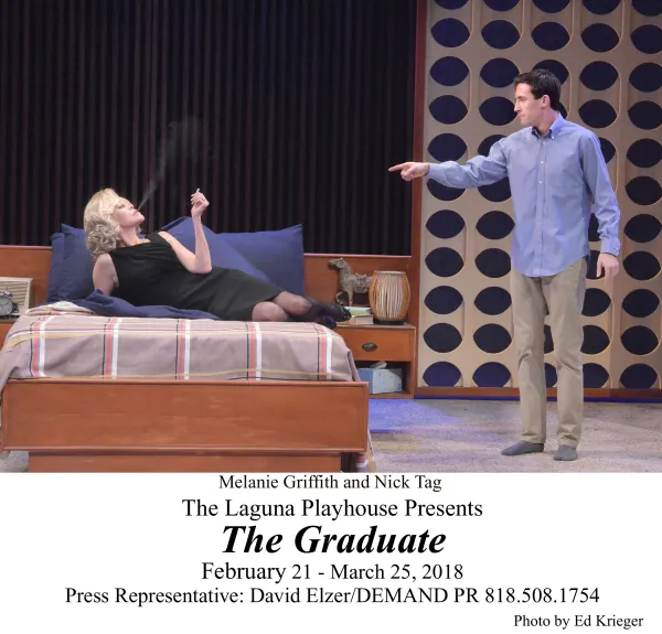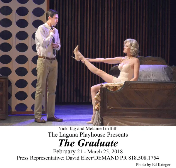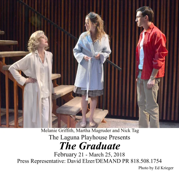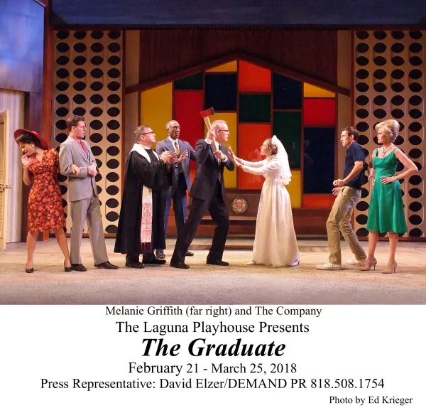The week before British playwright Terry Johnson’s stage version of Charles Webb’s 1963 novella The Graduate and Buck Henry and Calder Willingham’s 1967 screenplay premiered at Laguna Playhouse, I happened to re-watch the classic movie on the IFC or Sundance Channel. I was struck by a number of things and wondered how could one translate its cinematic language to the medium of theatre, with real life movie star Melanie Griffith stepping into the role Anne Bancroft immortalized, that lecherous lush Mrs. Robinson?