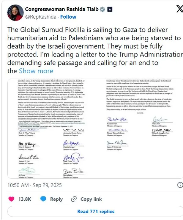 US Rep. Rashida Tlaib, who is the only Palestinian American in US Congress, wrote a letter to Sec. of State Marco Rubi which was signed by 18 other members of Congress stating, "The safety of the Global Sumud Flotilla's civilian passengers is at serious risk and requires immediate action," adding, "As the Trump administration fails to take action to stop the genocide, hundreds of brave civilian volunteers from over 40 countries – including the United States – have set sail to Gaza to deliver essential aid, establish a humanitarian corridor, and save lives."