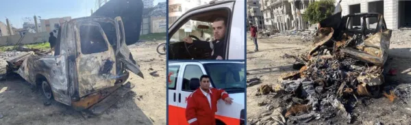The ambulance that tried to rescue Hind, and the two drivers, who were struck and killed by Israeli forces. (social media)