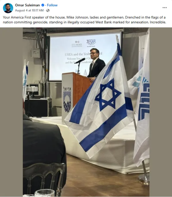 Rather than meeting with their constituents in their home districts during summer recess, Speaker Mike Johnson and his troops were in Israel lobbying and defending Israel's genocidal policies. Mr. Speaker told the world that the West Bank belongs to Jews "by right" during a settlement visit. He is following a misguided form of Christianity and does not understand the virtues of separation of church and State.