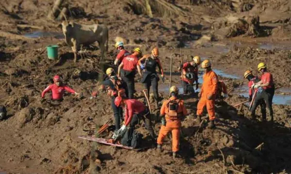 Futilely digging and searching for the missing bodies of mine employees and others buried in the sludge after the earthen tailings dam dissolved and destroyed everything downstream. This shows what was once a relatively narrow river.