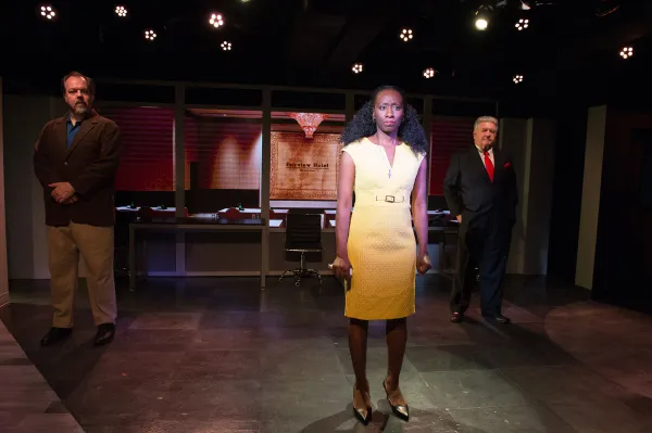 Sachs’ Capra-esque homage opens in a daily’s newsroom with longtime columnist Andy Kramer (Rob Nagle) nagging and confronting newcomer Carl Miller (Matt Kirkwood, who - like much of the seven-person cast - has multiple parts), who is more bean counter than editor. In this day and age of mergers and acquisitions, Miller has been installed by Harold (not Herman!) Cain (stage/screen stalwart James Harper) to be the media mogul’s hit man in order to make the rag profitable. Of course, this means downsizing, reorienting from print to digital, etc., but worst of all, replacing reporting the news per se with more marketable “content” that passes for “journalism.”